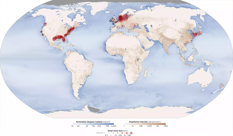 红色圆圈表示2010年死区的大小和位置。黑点表示未知大小的死区。 深蓝域表示水肥沃,可能会导致死区。